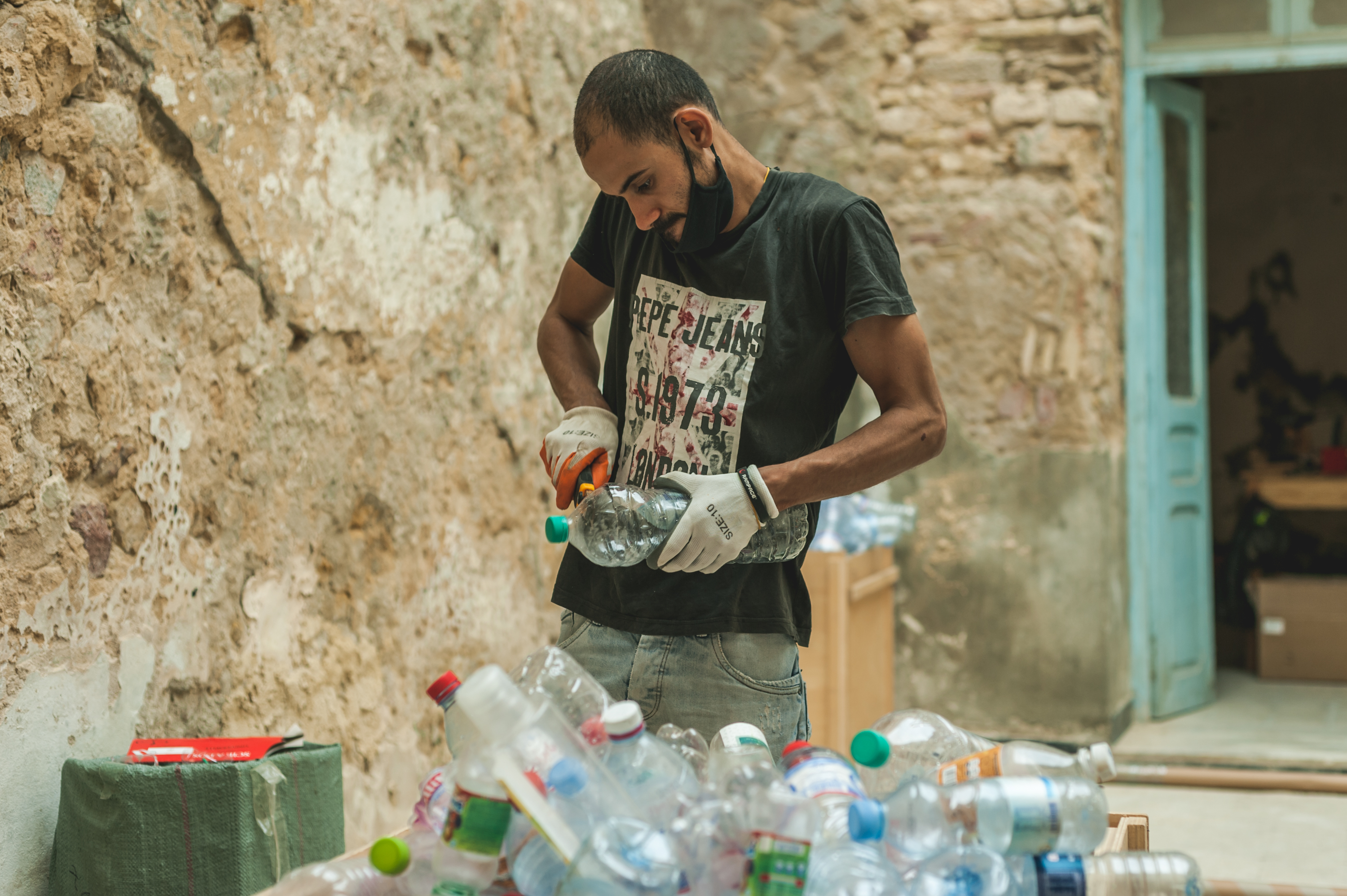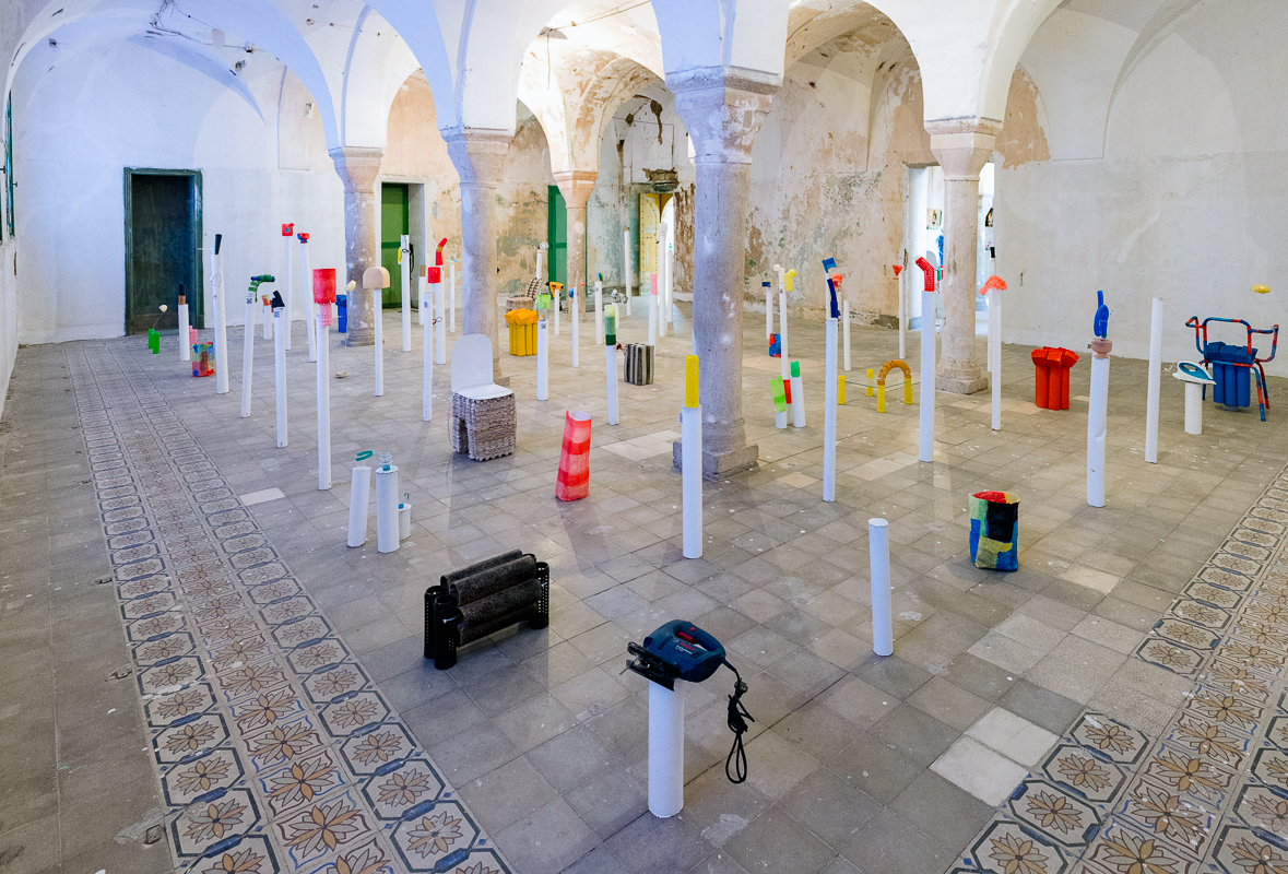 During two residencies with L’Art Rue, between 2020 and 2021, the Tunis-based French architect and designer Thomas Egoumenides develops an ephemeral laboratory named Rascal, for the design and valorization of wasted materials. These residencies housed in the heart of the medina of Tunis bring together six, then four young people – Akram Mahjoubi, Hatem El Fethi, Raed Gnichi and Youssef Mechichi. They are initiated to upcycling and design through an experimental approach based on the “pedagogy of error”. An empowering approach where you get to learn by trying, experimenting and adjusting to your needs.